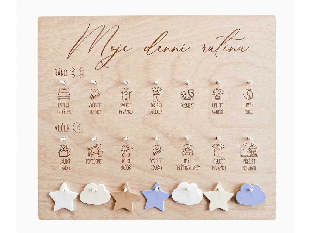 Cedule zobrazuje ranní a večerní rutinu rozdělenou do jednotlivých kroků. Každý úkol (např. vyčistit zoubky, uklidit hračky, obléct se...) je znázorněn pomocí jednoduchého obrázku a textu. Když dítě úkol splní, označí ho barevnou ikonou (hvězdička nebo mráček), kterou jednoduše zavěsí na kolíček pod danou činnost.