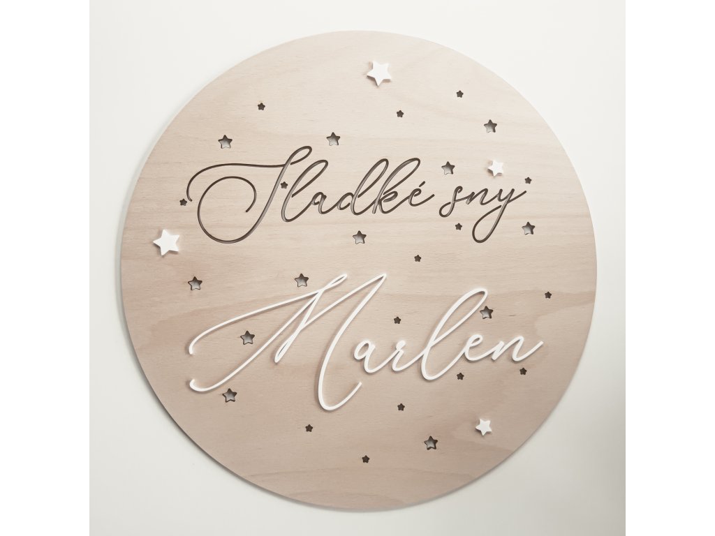 Jméno na přání je vyrobeno pomocí 3D tiskárny ( můžete si vybrat barvu jména: bílá, černá, šedá, růžová, modrá ), hvězdičky a nápis Sladké sny jsou vyřízlé laserem naskrz, ve tmě tak krásně vyniknou.
