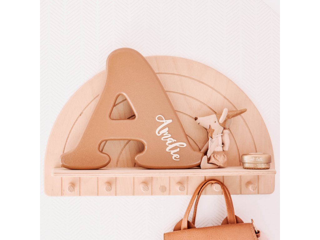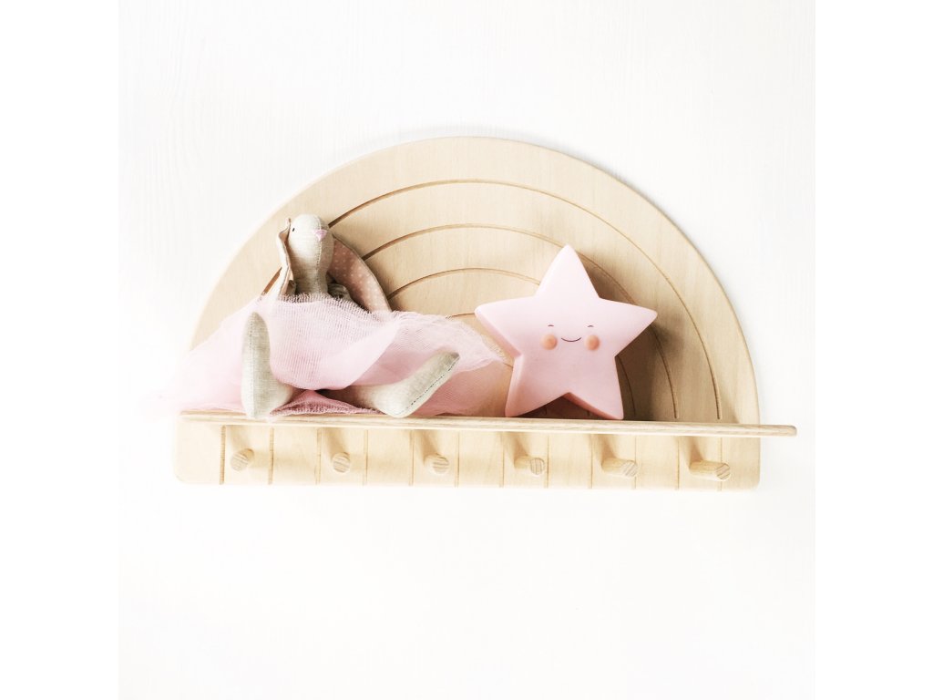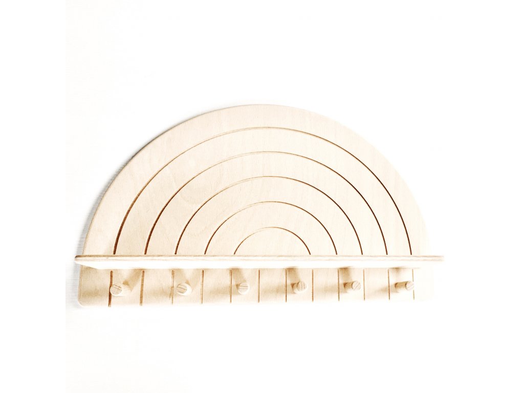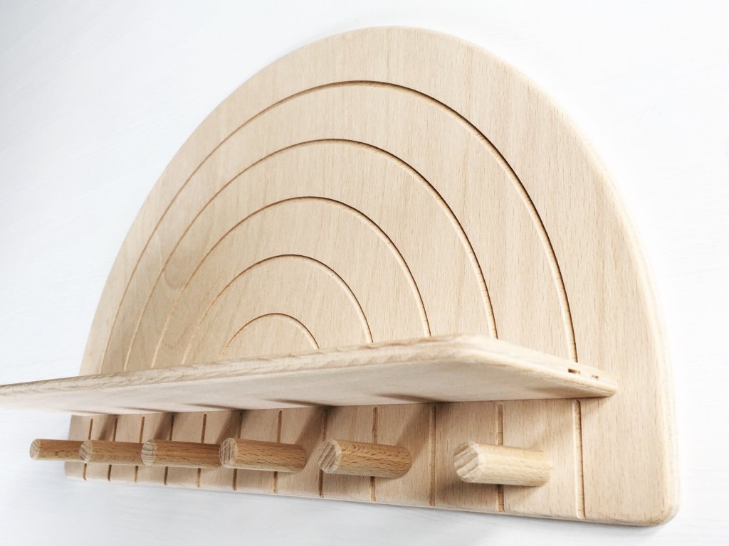 POLIČKA SE 6 VĚŠÁČKY ve tvaru duhy s vyfrézovanými drážkami z bukové překližky tl. 8 mm. Tato polička stylově doladí Váš dětský pokoj, pokud máte rádi přírodní barvy nebo jejich kombinace. Na zadní straně jsou dva vyfrézované otvory pro pohodlné zavěšení.